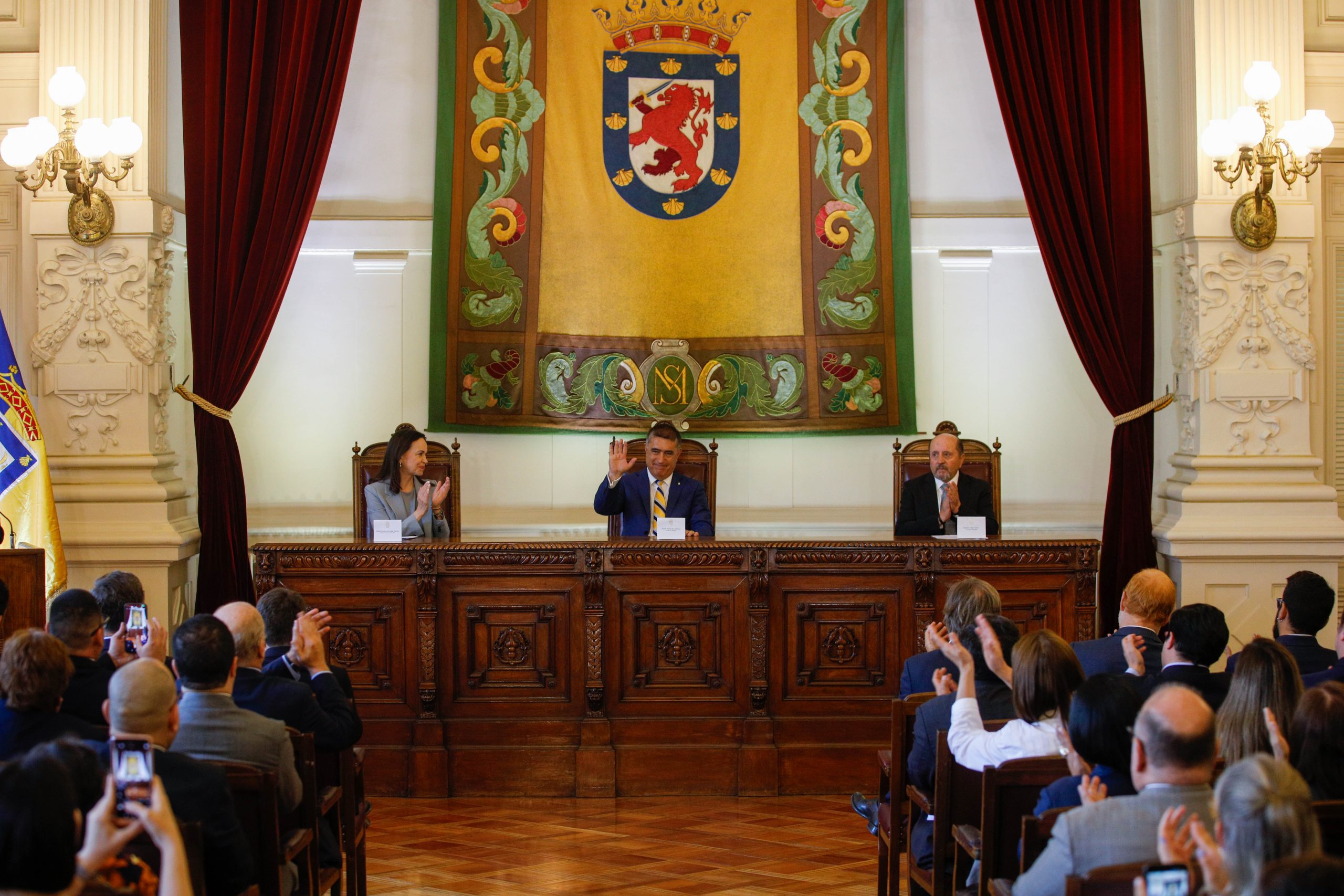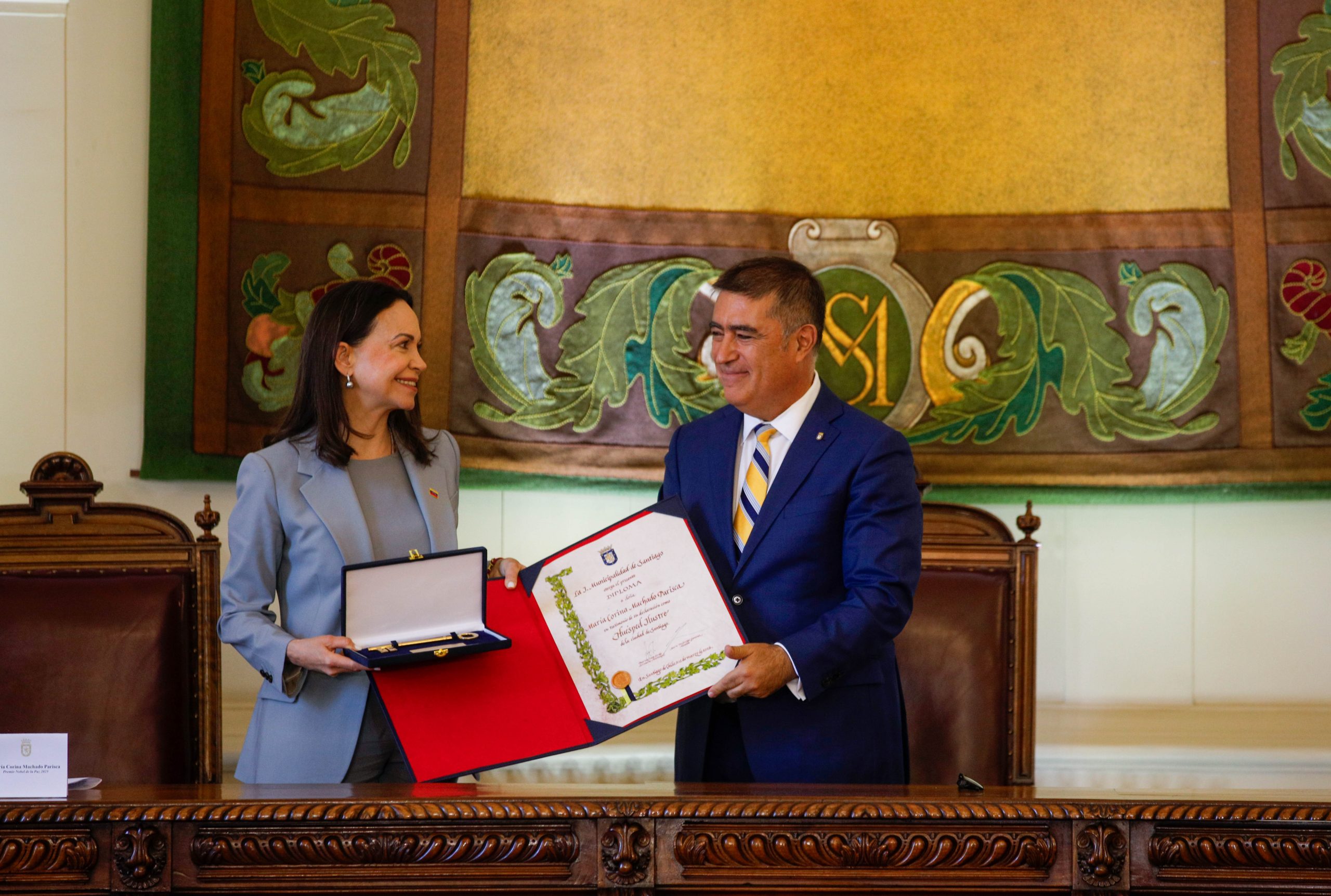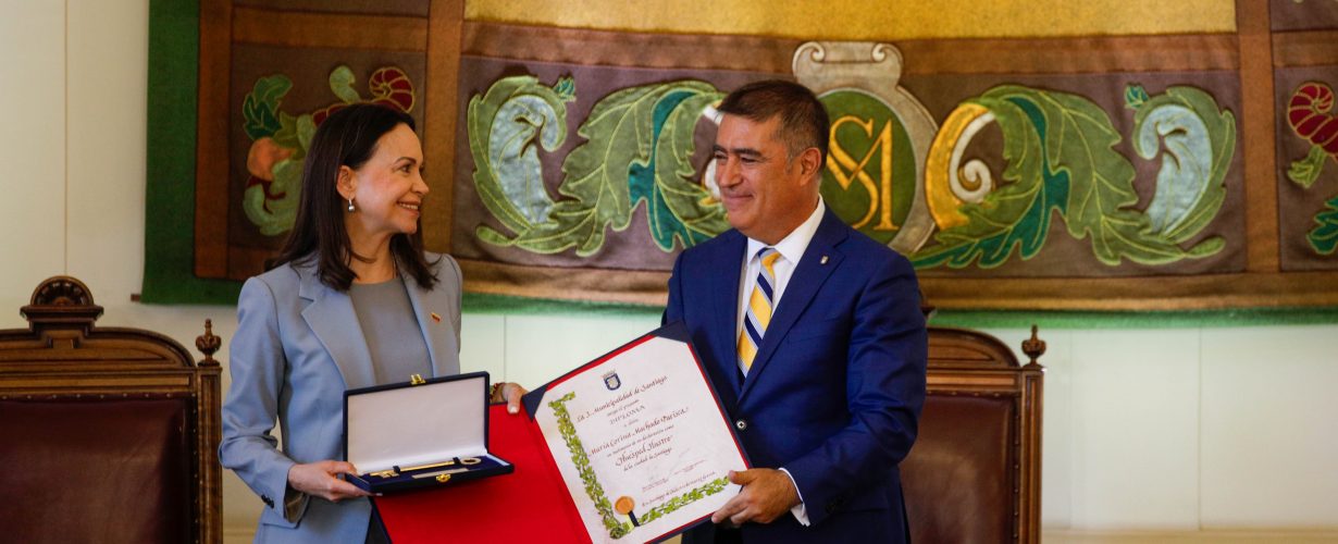 El alcalde de Santiago, Mario Desbordes, entregó las Llaves de la Ciudad y declaró Huésped Ilustre a la líder venezolana y Premio Nobel de la Paz, María Corina Machado, en una ceremonia realizada en el Salón de Honor del Palacio Consistorial. La actividad contó con la presencia de senadores, diputados, el gobernador regional, delegaciones diplomáticas, dirigentes sociales, representantes de la comunidad venezolana y vecinos de la comuna.