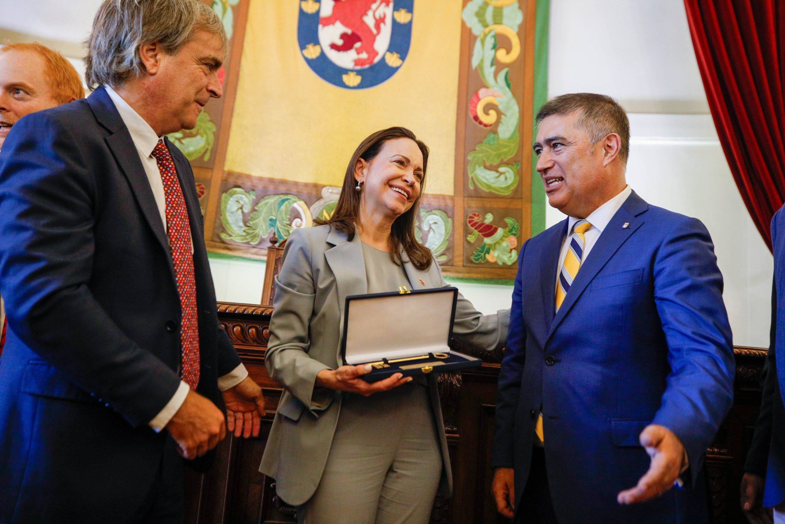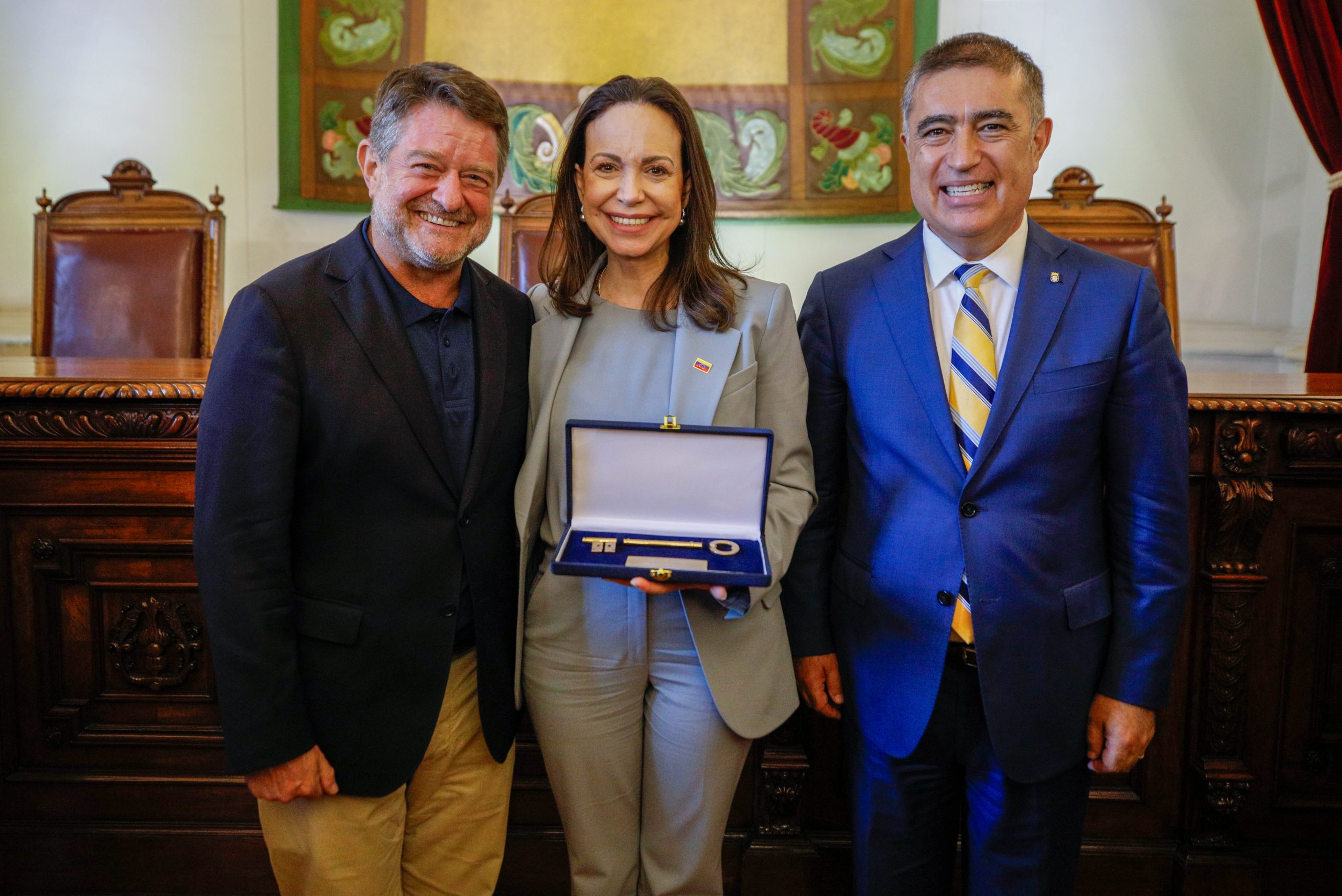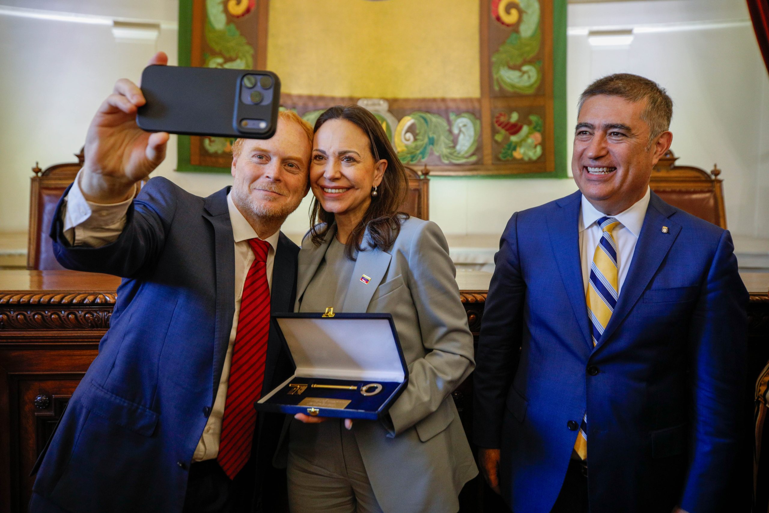 El alcalde de Santiago, Mario Desbordes, entregó las Llaves de la Ciudad y declaró Huésped Ilustre a la líder venezolana y Premio Nobel de la Paz, María Corina Machado, en una ceremonia realizada en el Salón de Honor del Palacio Consistorial. La actividad contó con la presencia de senadores, diputados, el gobernador regional, delegaciones diplomáticas, dirigentes sociales, representantes de la comunidad venezolana y vecinos de la comuna.