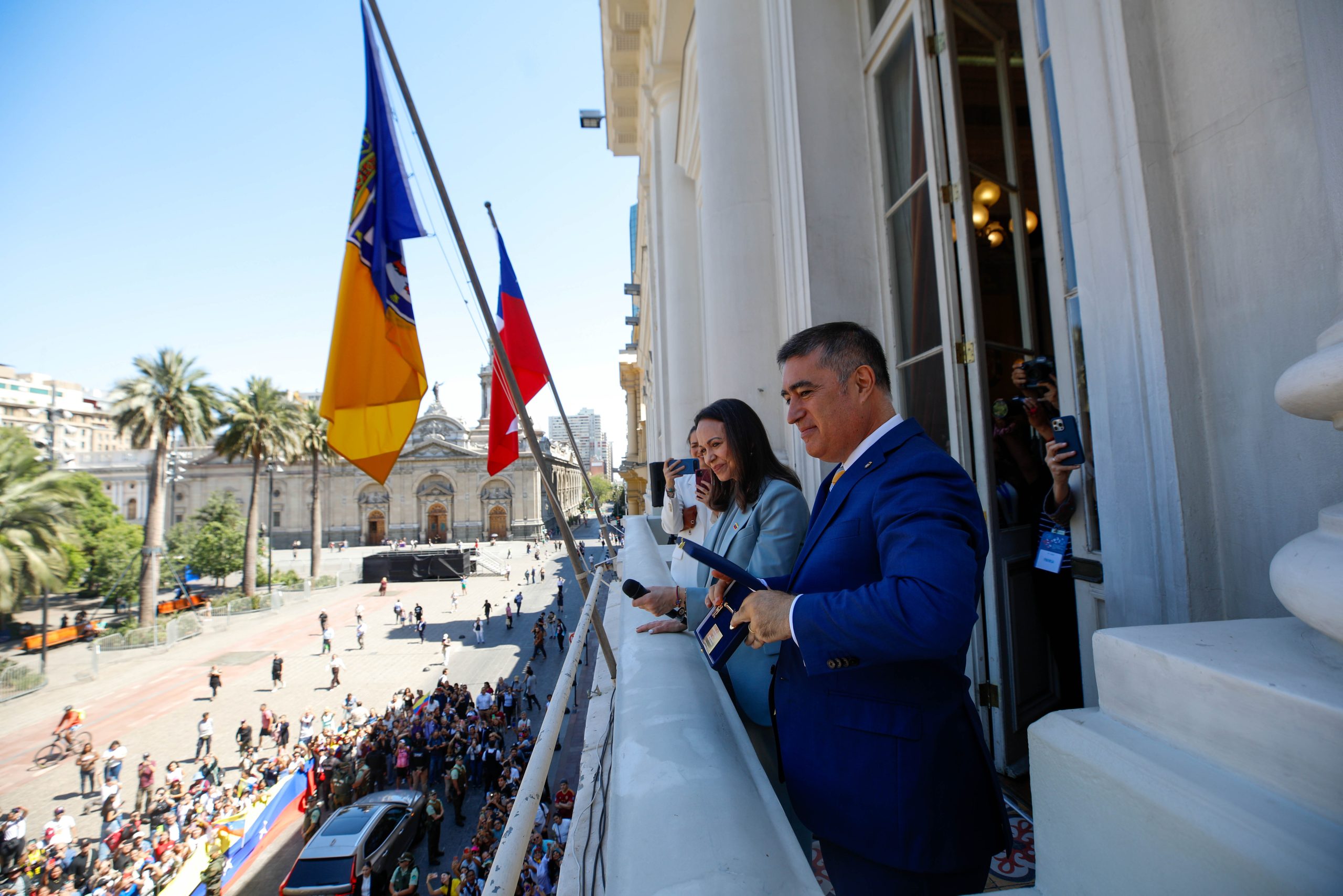 María Corina Machado fue recibida por cientos de personas que se congregaron en la Plaza de Armas de Santiago. Desde el balcón del municipio, saludó a los asistentes, quienes la recibieron con aplausos y muestras de apoyo.