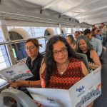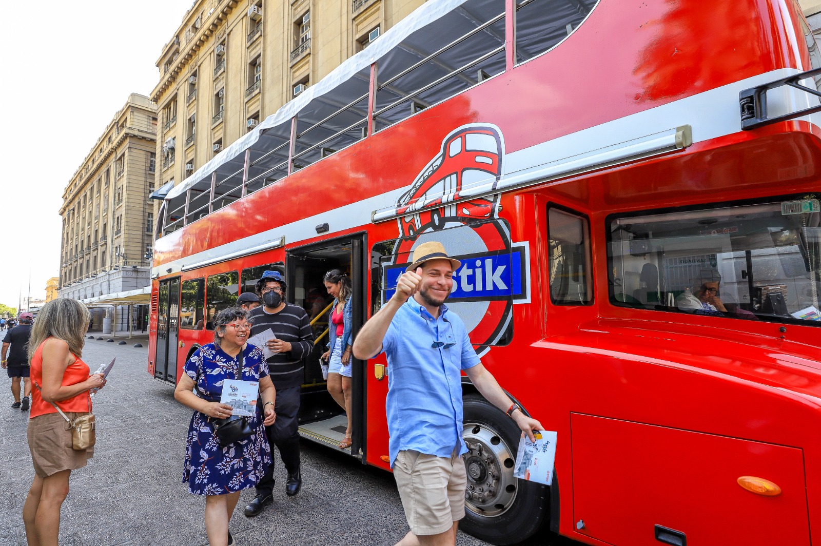 Frente a las renovadas letras volumétricas de “Stgo”, pintadas con los colores institucionales de la municipalidad y mostrando como fondo el Palacio Consistorial, el Museo Histórico Nacional y otros edificios patrimoniales, se inició el recorrido por el casco histórico, que contó con la participación de guías turísticos que relataban los hitos históricos de los distintos edificios patrimoniales. En una breve parada por el museo Casa Colorada, los invitados apreciaron cartografías y maquetas que muestran la evolución de la comuna desde su fundación.