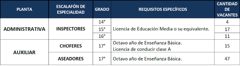Informamos que, en atención a lo dispuesto en los artículos 40° y 41° de la Ley N°18.695 Orgánica Constitucional de Municipalidades, los artículos 10° y 11° de la Ley N°18.883, Estatuto Administrativo para Funcionarios Municipales, el Reglamento N°915 de fecha 11 de diciembre de 2019, que modifica y establece planta de personal de la I.M.S., llama a Concurso Público para proveer los siguientes cargos vacantes de la Planta Administrativa y Auxiliar Municipal: