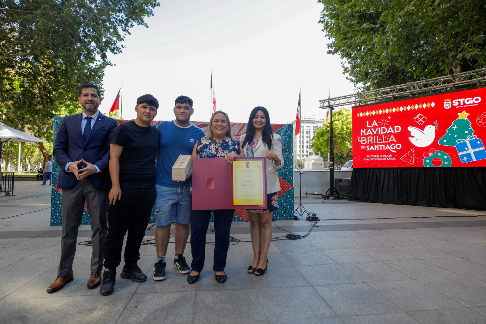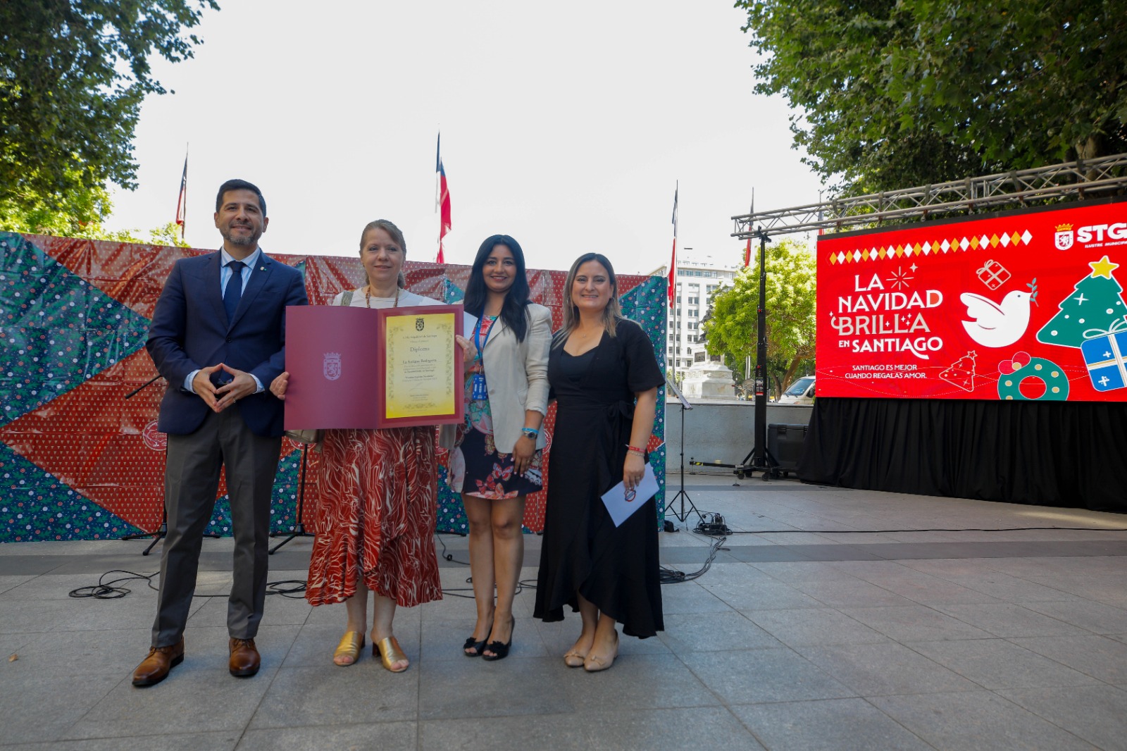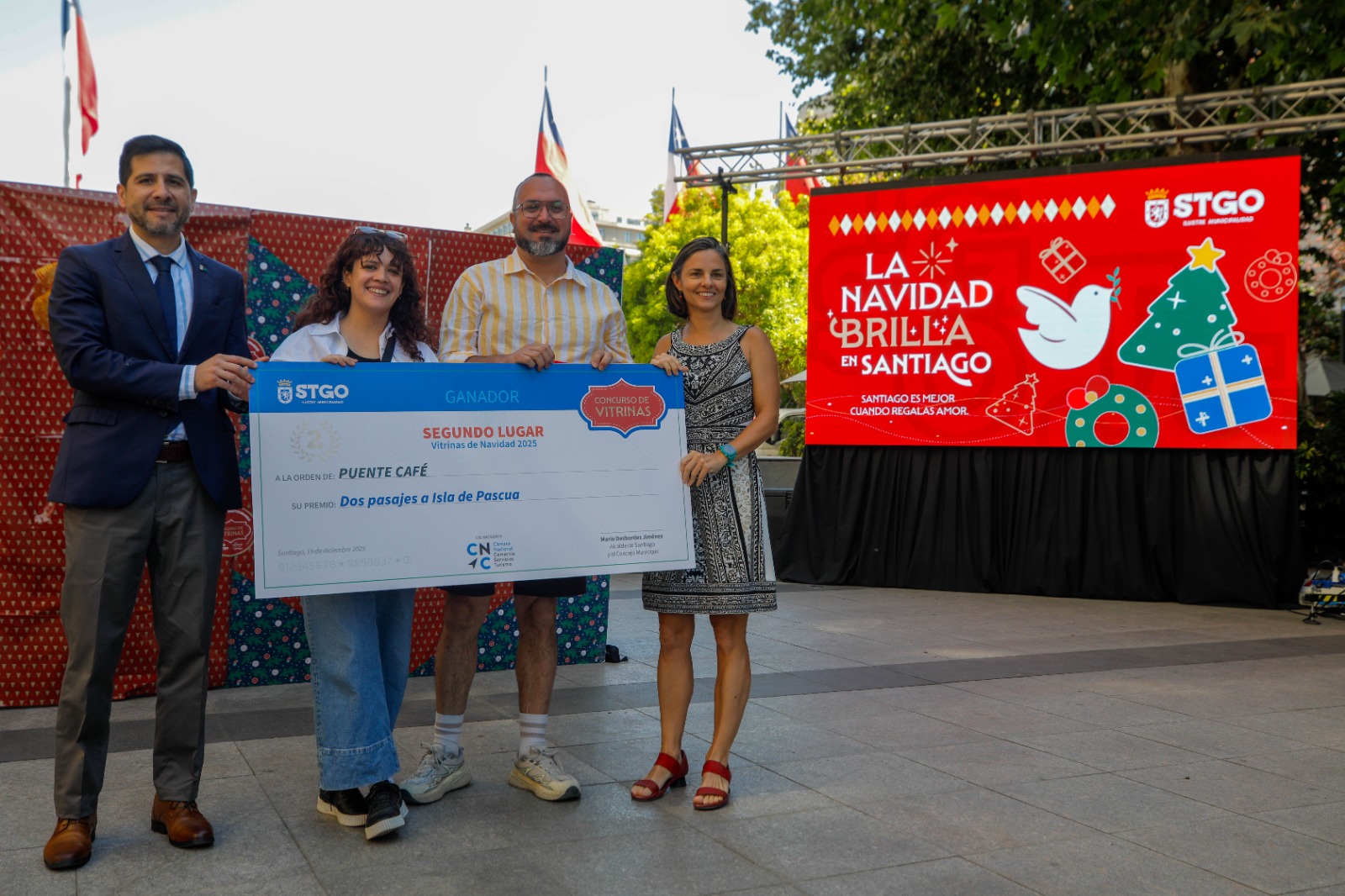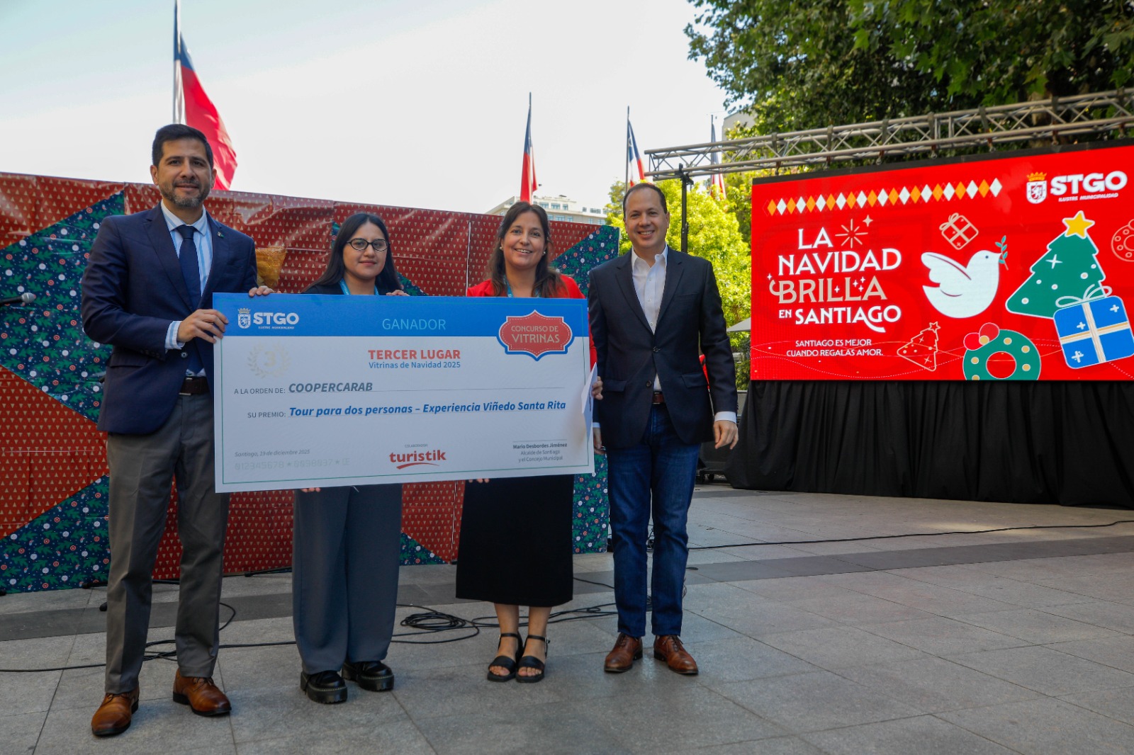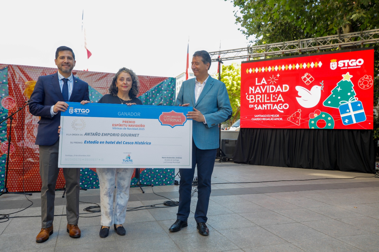 Uno de los hitos centrales de la jornada fue la premiación del Concurso Vitrinas Navideñas de Santiago 2025, iniciativa impulsada por la Subdirección de Desarrollo Económico Local, que convocó a 80 vitrinas de comercios de distintos barrios de la comuna, recuperando una tradición urbana que pone en valor la creatividad, el esfuerzo de los locatarios y la identidad comercial de la comuna de Santiago.